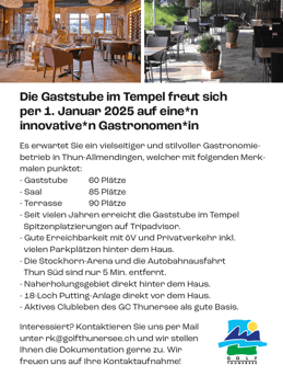 Im August 2024 hat die mille prive gmbh zusammen mit der Gastrokomission der Golf Thunersee Ag die Restauration der Gaststube im Tempel, neu Ausgeschrieben. Der Rekrutierungsprozess und die Ausschreibung konnte jetzt erfolgreich abgeschlossen werden. Siehe dazu auch unter der Rubrik News!