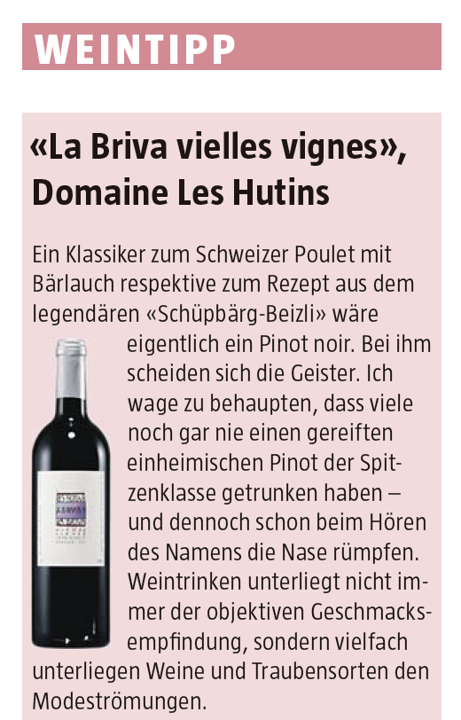 Urs Messerli empfiehlt: «La Briva vielles vignes (Domaine Les Hutins) passt hervorragend zum Schweizer Poulet mit Bärlauch. Probieren Sie das Rezept von Lukas Schär, Souschef im legendären Schüpbärg-Beizli, Schüpfen!»